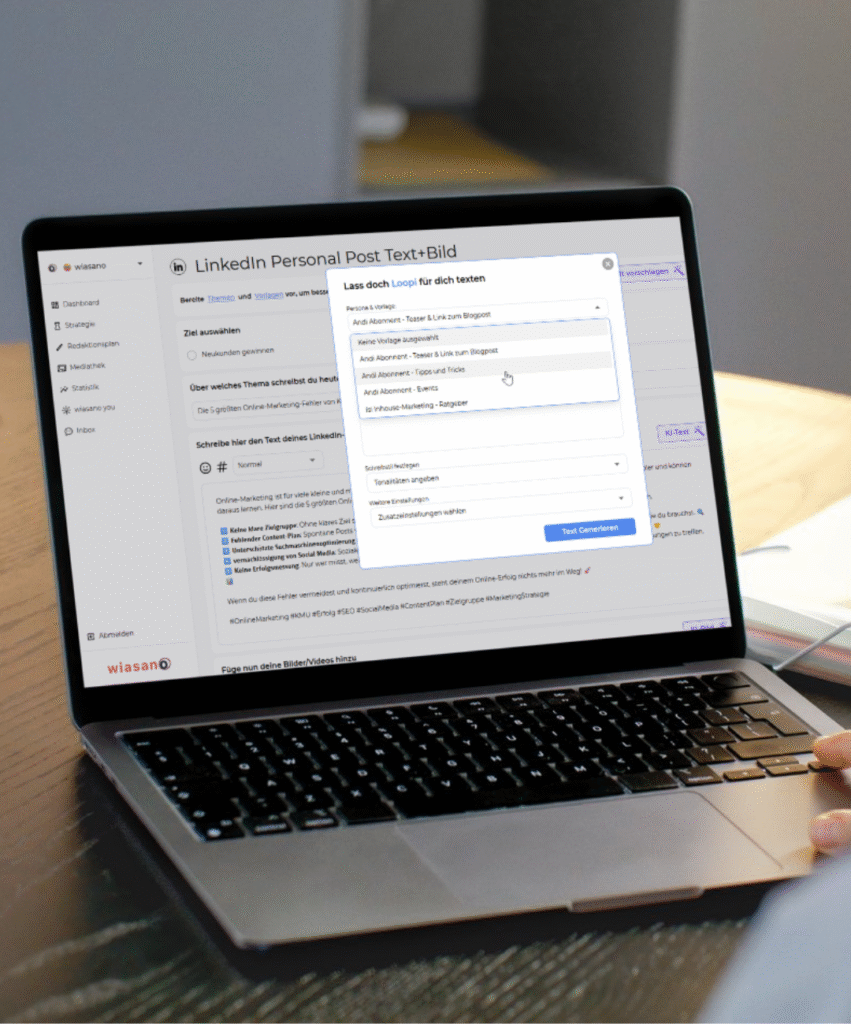 Mit wiasano erledigst du dein Online-Marketing in Minuten statt Stunden. Plane, erstelle und optimiere Inhalte automatisch. Ohne Stress und ohne Agentur!